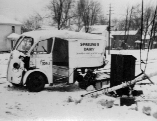 sliding door of the truck remained open to facilitate frequent exits to leave milk on porches. As Tom drove west down East South Street, the floodlights at the loading dock of Hillsdale Steel Products reflected off the snow, blending with the oncoming headlight of a Toledo-Hillsdale New York Central freight train. At that time, no signal except an alarm bell indicated when a train approached the crossing. Tom didn't hear it over the roar of the storm and continued toward the tracks. The northbound train plowed into the left front of the truck, spun it around and tossed it about 15 feet. Tom was ejected through his door, ending up against the unhelpful alarm bell. While his brother had only bruises, Tom was seriously injured and remained in a coma for about a week.