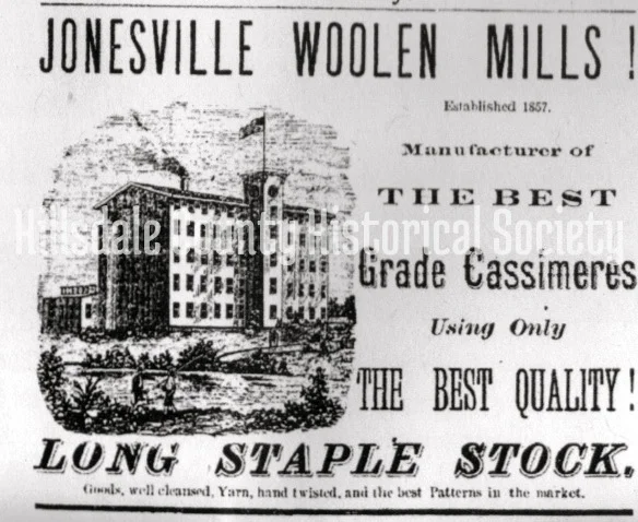 Initially begun in 1853, the Jonesville Woolen Mills was reorganized and sold to Ransom Gardner & Co. in 1860. The mill burned in early 1866, but was quickly rebuilt. Once the largest woolen mill in the state, by 1875 it had failed.
